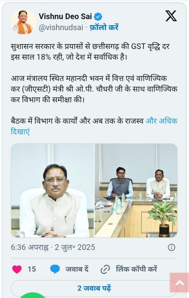 रायपुर। सुशासन के मार्ग पर अग्रसर छत्तीसगढ़ सरकार को एक बड़ी उपलब्धि हाथ लगी है। राज्य की वस्तु एवं सेवा कर (GST) संग्रहण दर इस वर्ष 18% रही, जो पूरे देश में सर्वाधिक है। इस उपलब्धि को लेकर बुधवार को मंत्रालय स्थित महानदी भवन में वाणिज्यिक कर विभाग की समीक्षा बैठक आयोजित की गई। वित्त एवं वाणिज्यिक कर मंत्री ओ.पी. चौधरी की अध्यक्षता में हुई इस बैठक में विभागीय कार्यों और अब तक के राजस्व संग्रहण की विस्तृत समीक्षा की गई। बैठक में कर अपवंचन की रोकथाम, जीएसटी संग्रहण में पारदर्शिता, और सशक्त निगरानी तंत्र विकसित करने पर विशेष जोर दिया गया।