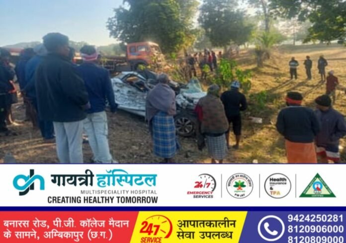 हाथोर समाचार,जशपुर। कटनी–गुमला राष्ट्रीय राजमार्ग क्रमांक 43 पर दुलदुला थाना क्षेत्र के पतराटोली में देर रात एक दर्दनाक सड़क हादसा हो गया। आस्ता से लौट रही एक तेज रफ्तार कार सड़क किनारे खड़े ट्रेलर में जा घुसी। टक्कर इतनी जोरदार थी कि कार पूरी तरह क्षतिग्रस्त हो गई और उसमें सवार पांचों युवकों की मौके पर ही मौत हो गई। घटना के बाद पूरे क्षेत्र में शोक का माहौल है।