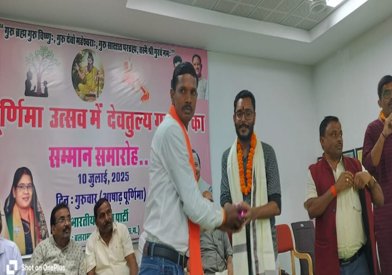 जिला मुख्यालय बलरामपुर में गुरु पूर्णिमा के अवसर पर अलग-अलग विधाओं में गुरुओं का सम्मान किया गया, इस कार्यक्रम में मुख्य रूप से जिला भाजपा अध्यक्ष ओम प्रकाश जायसवाल, नगर पालिका अध्यक्ष लोधी एक्का,गोपाल कृष्ण मिश्र,बिहारी पाल,बंसीधर गुप्ता, दीनानाथ यादव,दिलीप सोनी, सत्य प्रकाश सिंह, कोदूराम द्विवेदी, डॉ अर्चना गुप्ता,इत्यादि वरिष्ठों के साथ साथ शिक्षक, शिक्षिकाओं एवं स्वामी आत्मानंद स्कूल से आए सैकड़ों बच्चों और स्थानीय लोगों की मौजूदगी रही कार्यक्रम के संयोजक मुन्ना लाल चौधरी एवं भानु प्रकाश दीक्षित रहे।