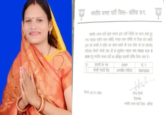 बैकुण्ठपुर। भारतीय जनता पार्टी ने प्रदेश संगठन के निर्देशानुसार नगर पंचायत पटना के अध्यक्ष और पार्षद पदों के लिए प्रत्याशियों की सूची जारी कर दी है। नगर पंचायत चयन समिति, मंडल चयन समिति और जिला कोर कमेटी के अनुमोदन के बाद, संभाग प्रभारी राजा पाण्डेय और संभागीय संयोजक गोमती साय की सहमति से यह घोषणा की गई। भाजपा जिलाध्यक्ष देवेन्द्र तिवारी ने बताया कि नगर पंचायत पटना के अध्यक्ष पद के लिए पार्टी की अधिकृत प्रत्याशी गायत्री सिंह होंगी।