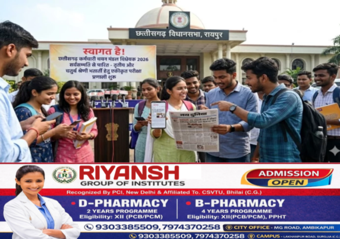 हाथोर समाचार,रायपुर। छत्तीसगढ़ में सरकारी नौकरियों की भर्ती प्रक्रिया को सरल, पारदर्शी और व्यवस्थित बनाने की दिशा में राज्य सरकार ने महत्वपूर्ण कदम उठाया है। तृतीय और चतुर्थ श्रेणी के पदों पर भर्ती के लिए अब एकीकृत परीक्षा प्रणाली लागू की जाएगी। इसके लिए ‘छत्तीसगढ़ कर्मचारी चयन मंडल विधेयक 2026’ को शुक्रवार को विधानसभा में सर्वसम्मति से पारित कर दिया गया।
