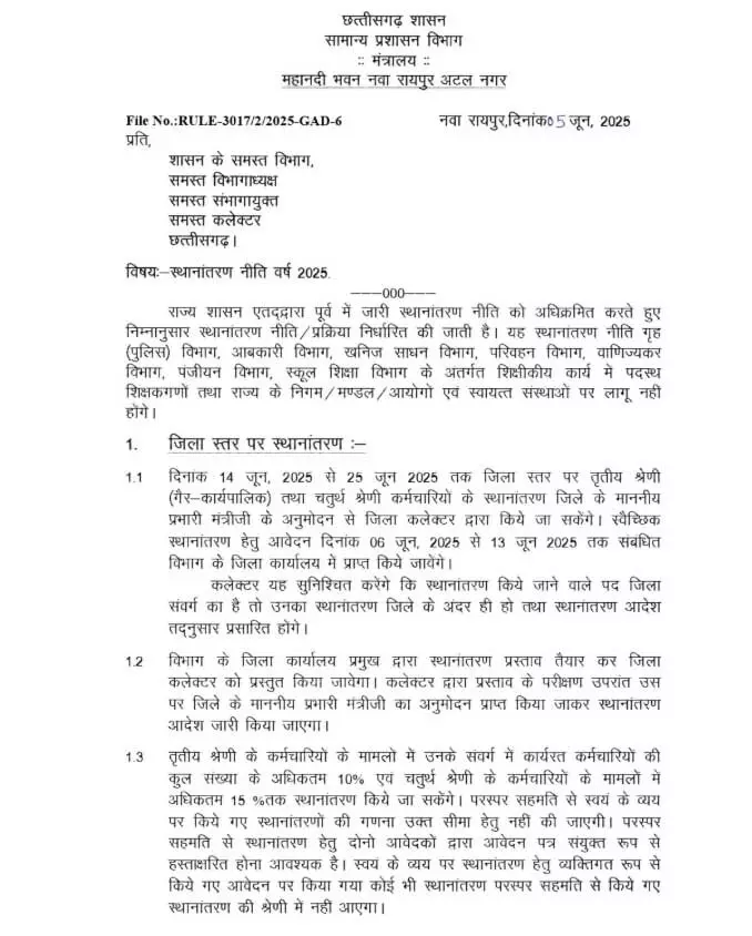 रायपुर। साप्रवि ने कल कैबिनेट से मंजूर नई तबादला नीति जारी कर दिया है। इसके तहत कल 6 जून से तबादले के इच्छुक अधिकारी कर्मचारियों से आवेदन लिए जाएंगे। और आदेश 14 जून से जारी किए जाएंगे। बता दें कि मंत्रिपरिषद द्वारा छत्तीसगढ़ शासन की वर्ष 2025 के लिए स्थानांतरण नीति का अनुमोदन किया गया। जिसके तहत जिला स्तर पर स्थानांतरण 14 जून से 25 जून तक प्रभारी मंत्री द्वारा और राज्य स्तर पर विभागीय मंत्री की मंजूरी से होंगे, न्यूनतम दो वर्ष सेवा अनिवार्य है, गंभीर बीमारी, मानसिक/शारीरिक अक्षमता और सेवा निवृत्ति से पूर्व एक वर्ष के मामलों में विशेष सुविधा मिलेगी। अनुसूचित क्षेत्रों से स्थानांतरण हेतु एवजीदार अनिवार्य है, साथ ही सुकमा, बीजापुर, नारायणपुर जैसे जिलों में रिक्त पदों को भरने का विशेष प्रयास रहेगा। तृतीय श्रेणी के कर्मचारियों के मामलों में उनके संवर्ग की कुल संख्या का अधिकतम 10 प्रतिशत एवं चतुर्थ श्रेणी कर्मचाारियों में अधिकतम 15 प्रतिशत स्थानांतरण किए जा सकेंगे।