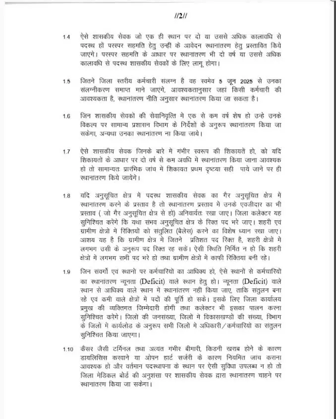 सभी जिला स्तरीय कर्मचारियों का संलग्नीकरण 5 जून 2025 से समाप्त माना जाएगा और जहां किसी कर्मचारी की आवश्यकता होगी स्थानांतरण नीति के अनुरूप स्थानांतरण किया जा सकेगा। स्थानांतरण के विरूद्ध 15 दिन में राज्य स्तरीय समिति को अभ्यावेदन किया जा सकेगा। 25 जून के बाद स्थानांतरण पर पूर्ण प्रतिबंध रहेगा, अत्यंत आवश्यक होने पर समन्वय में अनुमोदन उपरांत स्थानांतरण किया जा सकेगा।