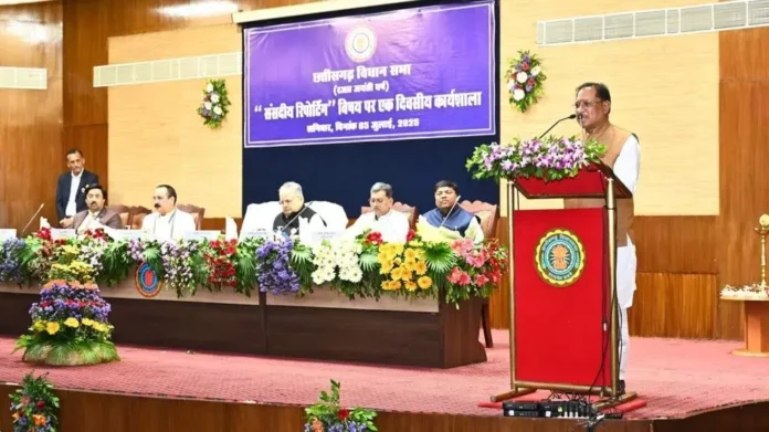 रायपुर। सीएम साय आज छत्तीसगढ़ विधानसभा के डॉ श्यामा प्रसाद मुखर्जी प्रेक्षागृह में आयोजित ‘संसदीय रिपोर्टिंग कैसे करें?’ विषयक कार्यशाला में विधानसभा अध्यक्ष डॉ. रमन सिंह के साथ सम्मिलित हुए। यह कार्यशाला पत्रकारों को संसदीय प्रणाली की समुचित जानकारी देने का सार्थक प्रयास है।