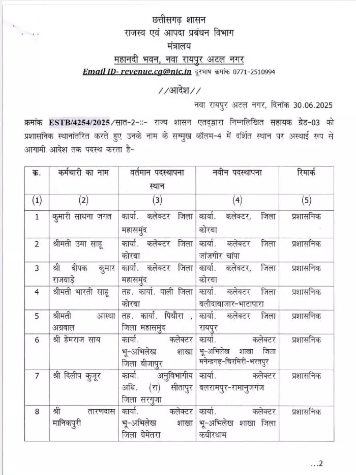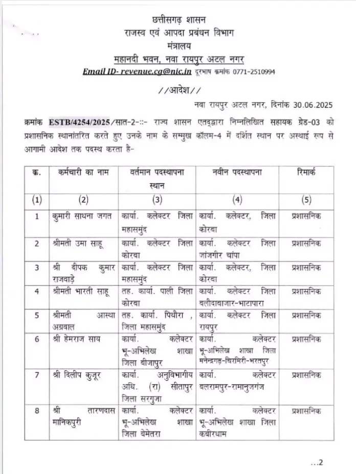 रायपुर। प्रदेश के जिला कलेक्टरों के कर्मचारियों के तबादले किए गए हैं। इस आशय के आदेश जारी कर दिए गए हैं।